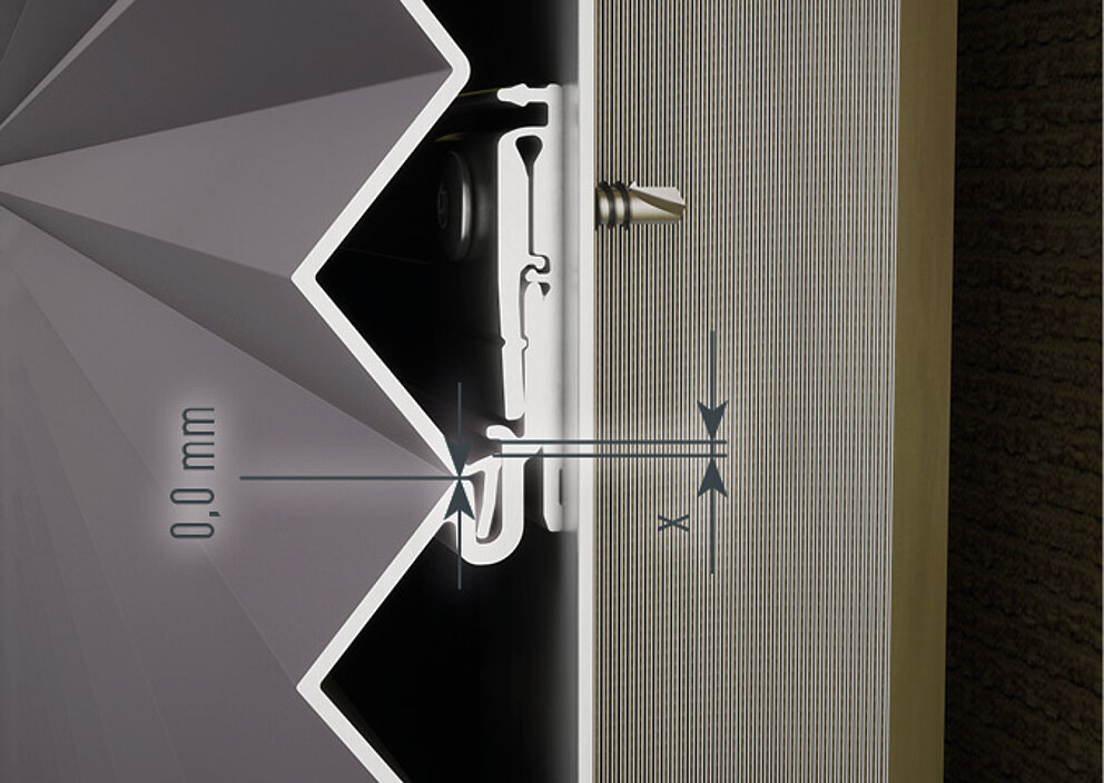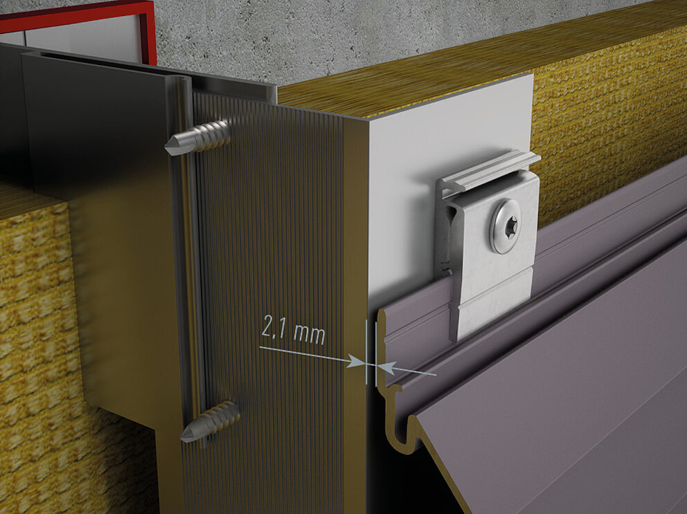 The installation system allows a compensation of +1.5 / -0 mm per cladding width. If compensation is required, it is recommended to distribute it across several profiles to ensure the straightness of the row and to avoid creating prominent joints. In this way, the compensation remains concealed and is almost imperceptible visually, resulting in a uniform and unobtrusive appearance.