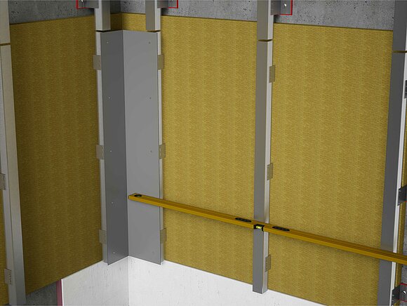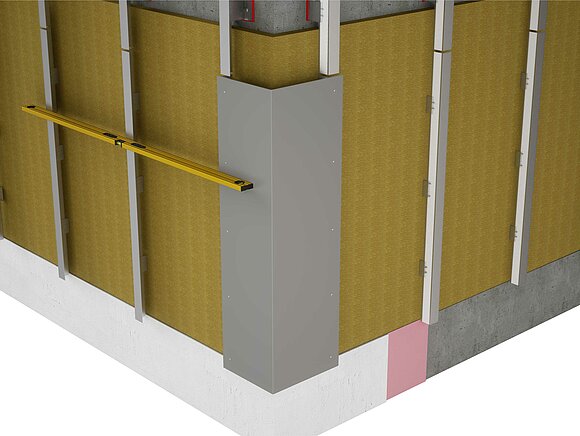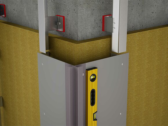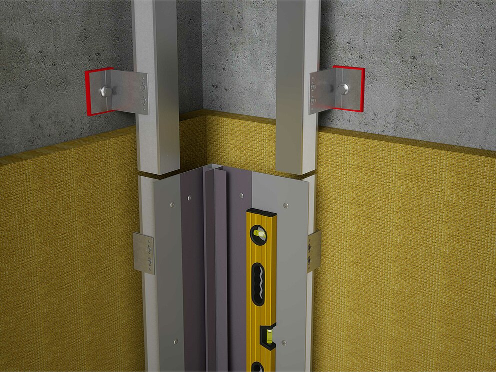 To install the internal or external corner, prepare the substructure for a horizontal profile installation. To install the internal or external corner profiles, you must first connect the vertical sub-structure framework using an angle bracket made from an aluminium sheet 2 mm in thickness or galvanised steel sheet (1 mm). Take account of the support profiles when installing the actual sub-structure framework itself in order to position the material thickness of the angle bracket closer to the inside, so as to guarantee that the sub-structure framework is even.