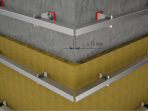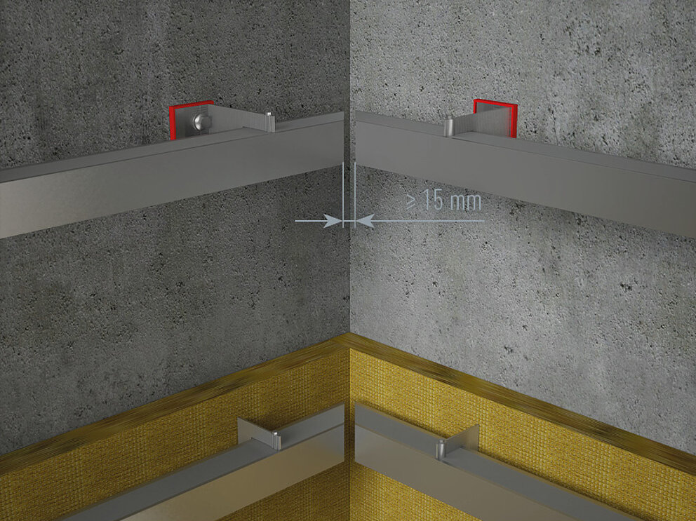 Vertically installed substructures must not join at corners; An expansion gap of approx. 15 mm should be provided. Fix and sliding points should be considered to allow for thermal movement.