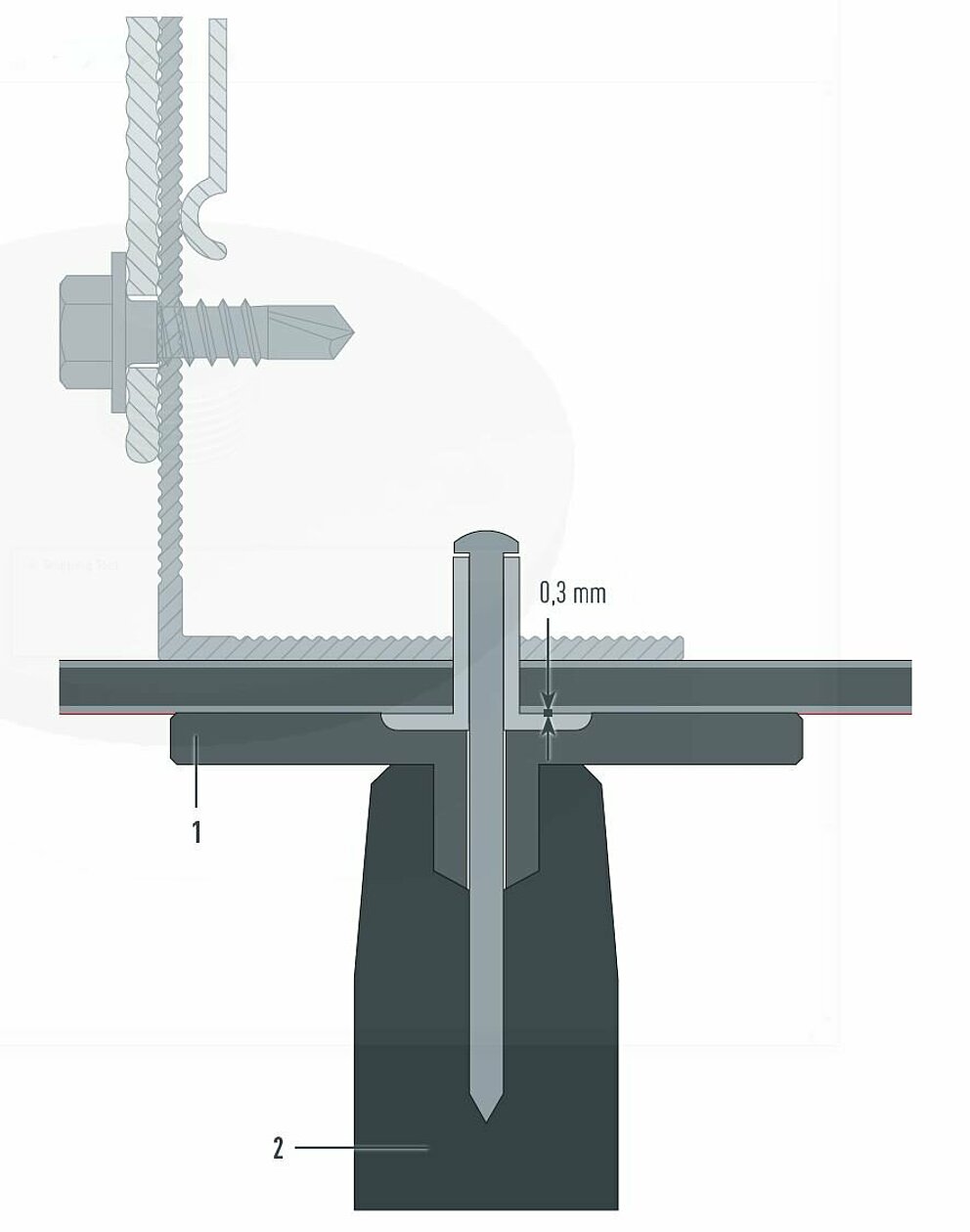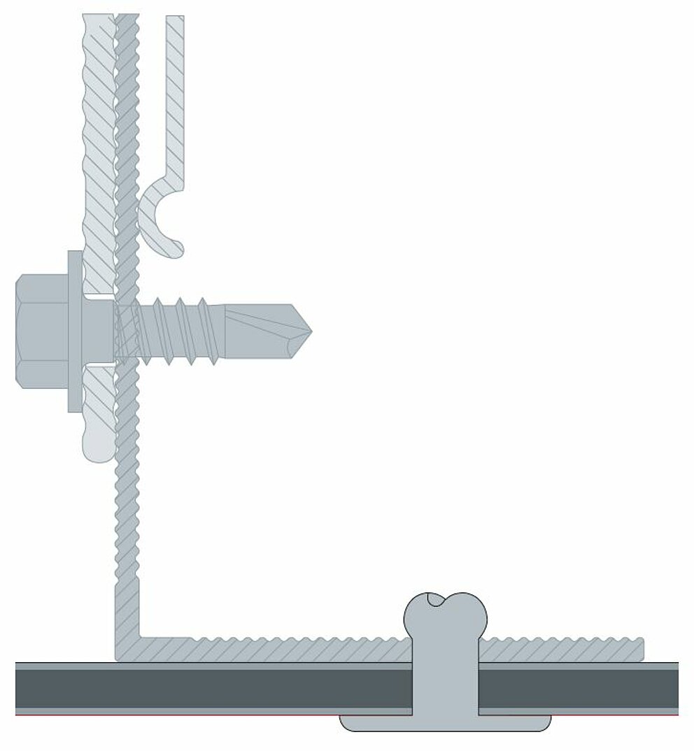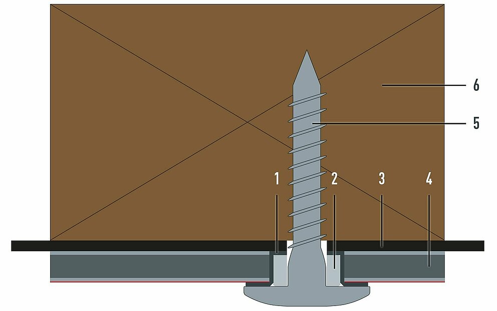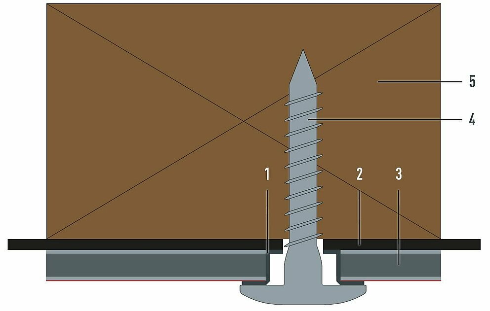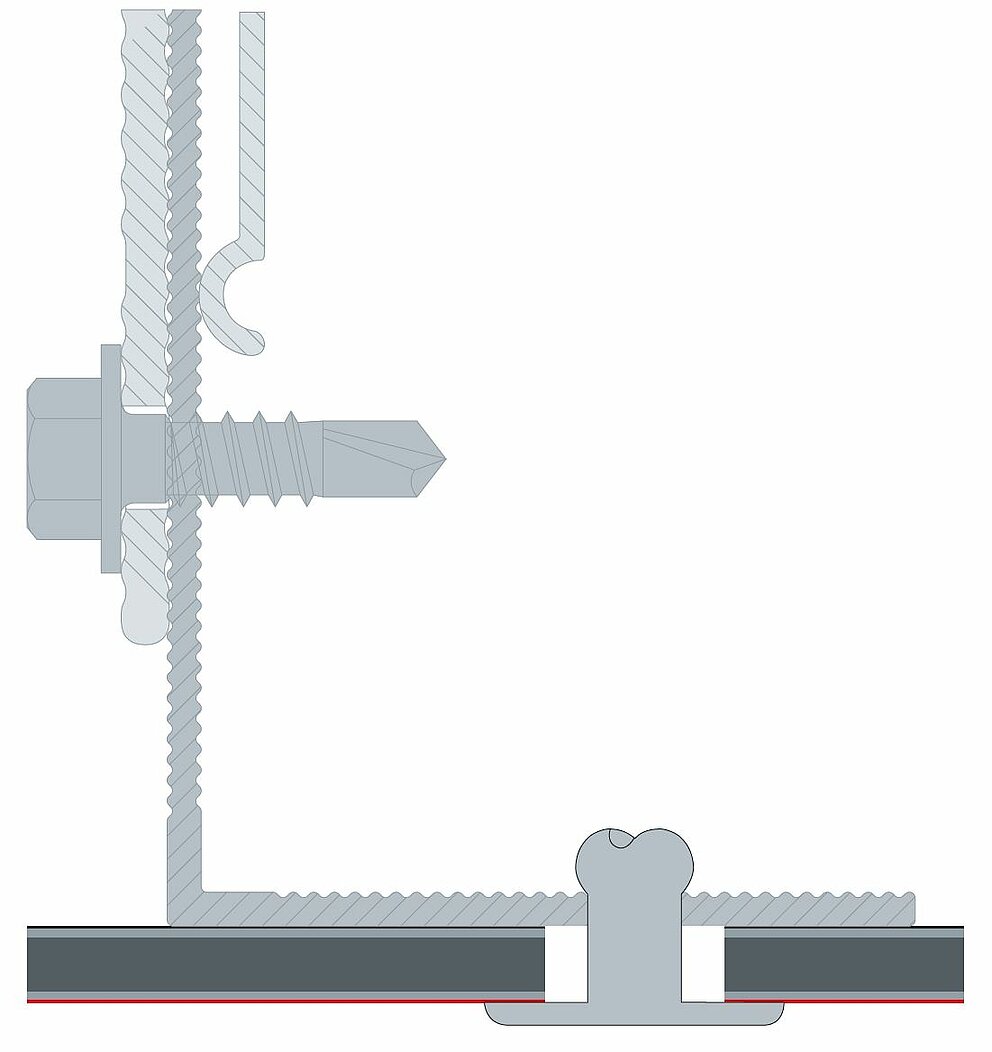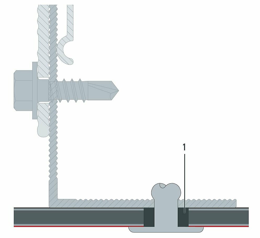The bore hole is larger than the diameter of the fastener. All fastening holes of the panel are pre-drilled using a ⌀ 9.5 mm drill bit. The metal rail is always pre-drilled with a hole size of ⌀ 5.1 mm. This is the only way for a sliding point to be able to absorb the thermal material expansion of the panel.