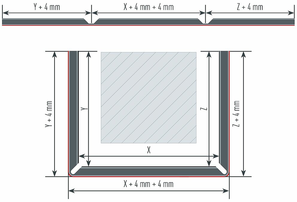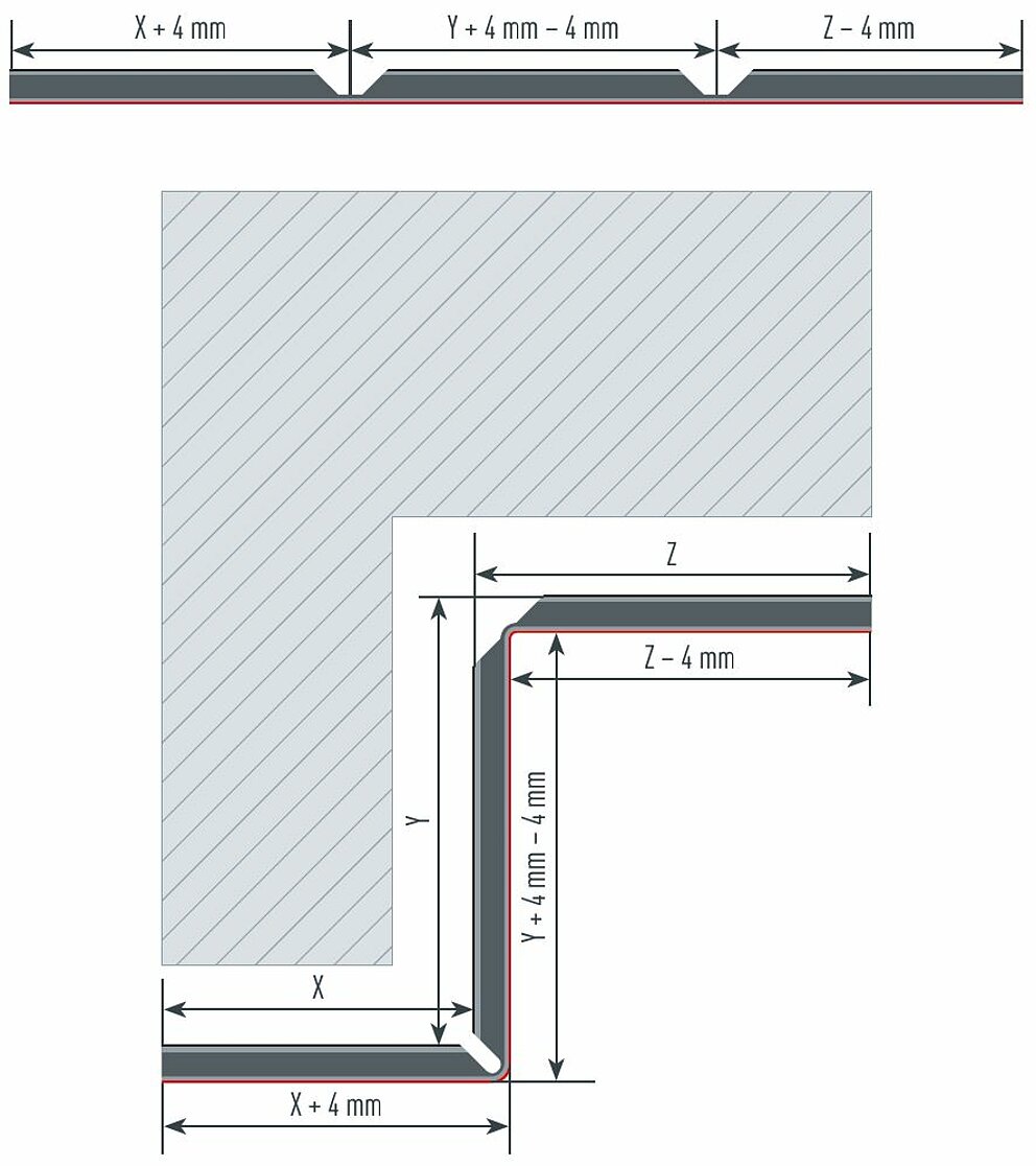 For an external corner, the material thickness of the composite panel (4 mm) is added to the actual measured dimensions.