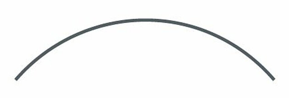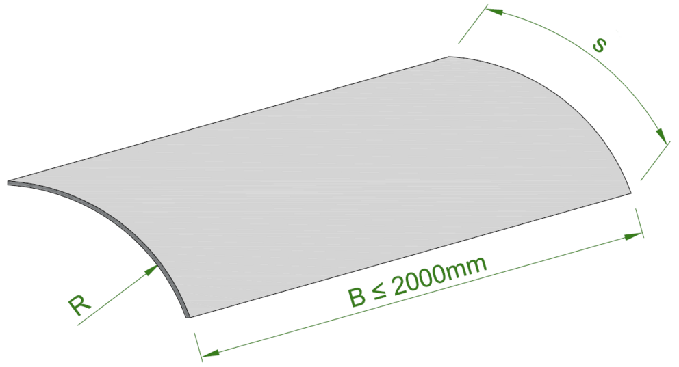 The roll bending process creates a small pressure mark on the panels which is trimmed by PREFA. Note the dimensions of the raw panel. At both ends, it is 200 mm larger in total than the radian measure actually required. 150 mm are added to the radian measure (s) at one end and 50 mm at the other end.
