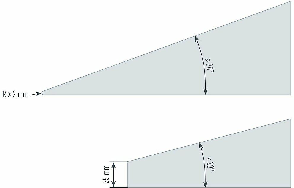 Observe the minimum dimensions and angles that are technically possible as far as the material is concerned. Acute angles can be produced from an angular opening of 20°. If the angular opening is less than 20°, the tip of the angle must be finalised using a bar of at least 25 mm.