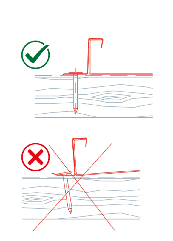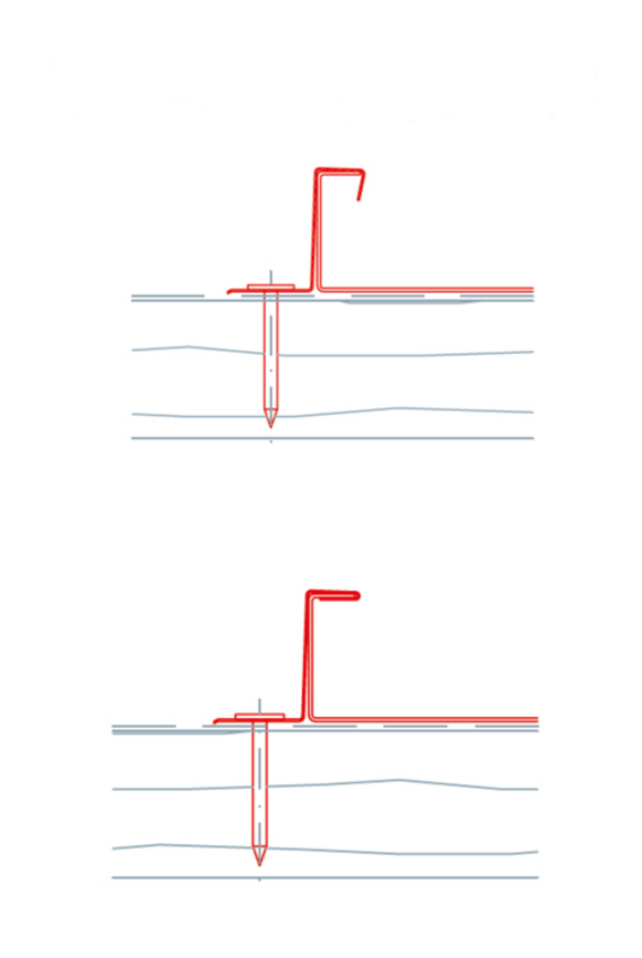 When fastening the PREFA stainless steel fixed clips and sliding clips, ensure that the grooved nails are sufficiently countersunk and do not protrude over the base of the clip in order to avoid pressure and chafe marks on the installed covering. PREFA stainless steel fixed clips must be installed with 2 stainless steel grooved nails. PREFA sliding clips must be installed with 3 stainless steel grooved nails.