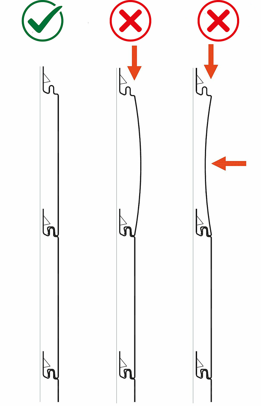 Please note that the installation must be carried out in a pressure-free state. Do not press the siding, siding.X or perforated siding too tightly into each other, as this can cause tension. The siding must be fit absolutely flat to the substructure to avoid concave or convex deformation of the siding.