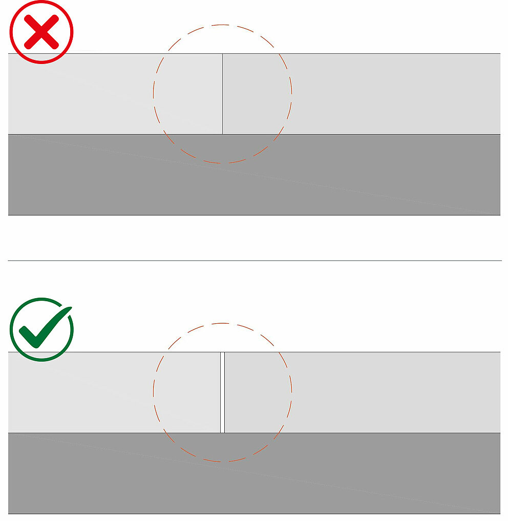 If using the PREFA joint, sidings can be installed vertically and horizontally with a maximum length of 2.500 mm. The width of the PREFA joint is 15 mm and corresponds to the shadow gap, and can be installed independent of the substructure. To butt join sidings without using the PREFA joint is not recommended, since the material expansion cannot be absorbed under tension.