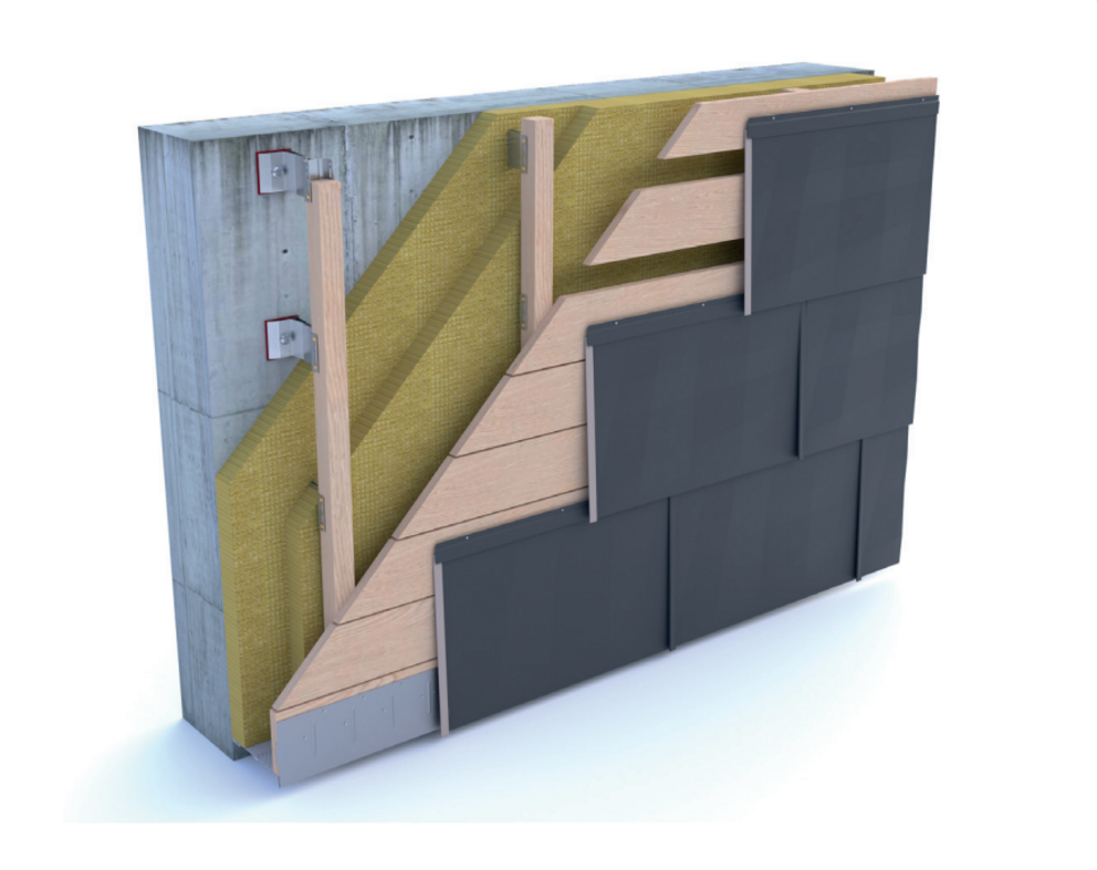 The FX.12 façade panel can also be installed on an open gap boarding (at least 24 mm thick). When installing on a open gap boarding a board must be placed under each fastening strip with a spacing of 420 mm to be achieved.