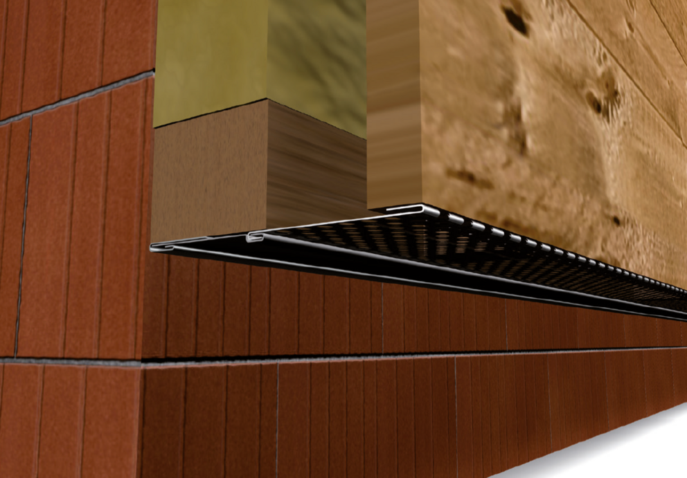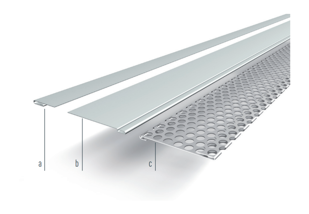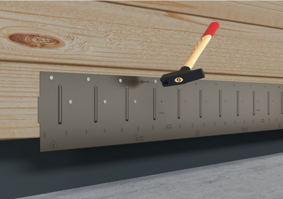 Once the details for the base area of the rainscreen (perforated metal plate and cover flashing) have been mounted, installation can begin using the starter strip. The starter strip is always the start of the construction of a façade with PREFA small-format products. The precise installation of the starter strip is important, as this significantly shapes the appearance of your façade.