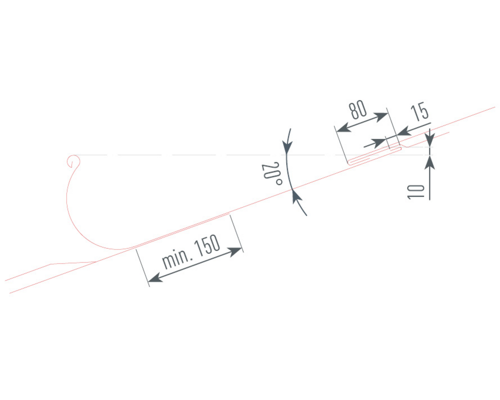 It is important to ensure that the roof gutter rear edge is 10 mm higher than the front of the edge gutter. This results in a minimum roof pitch of 20° for PREFA on-roof gutters (see figure below).