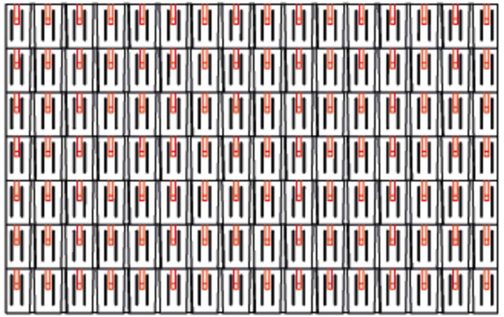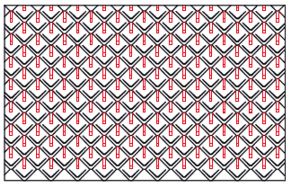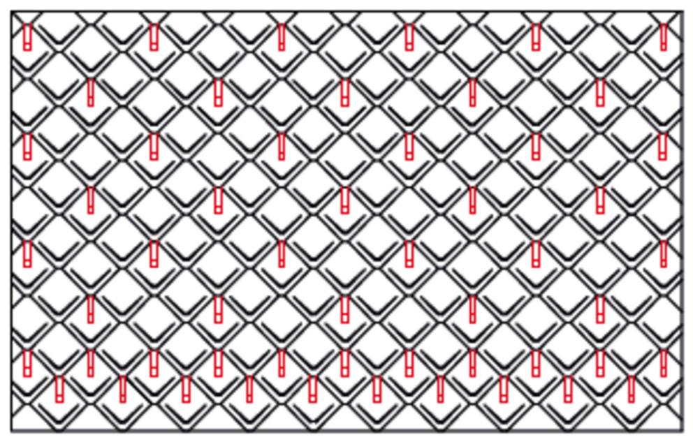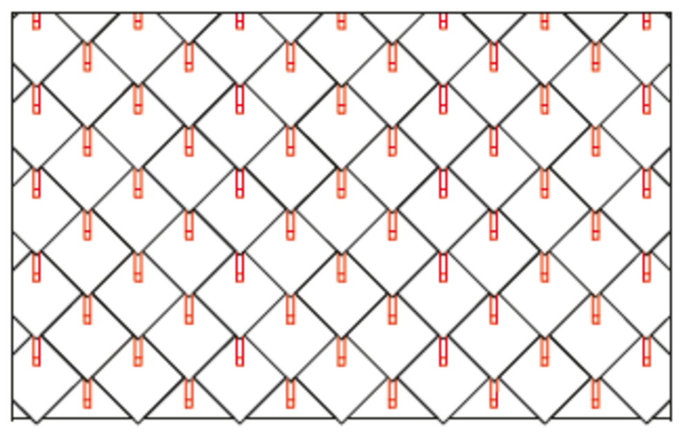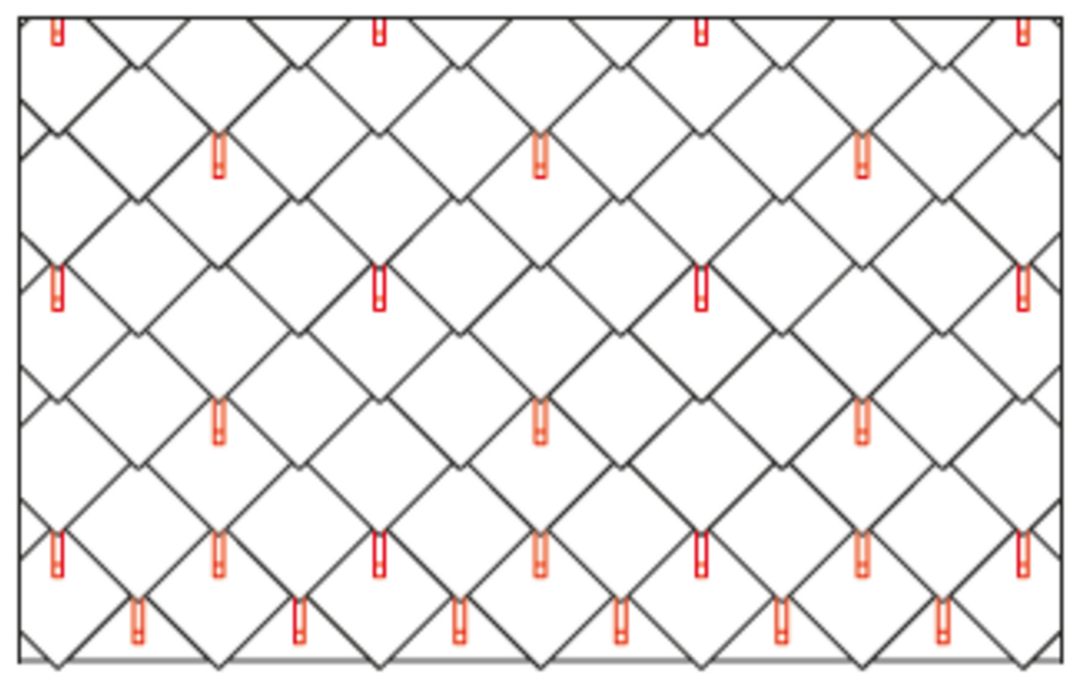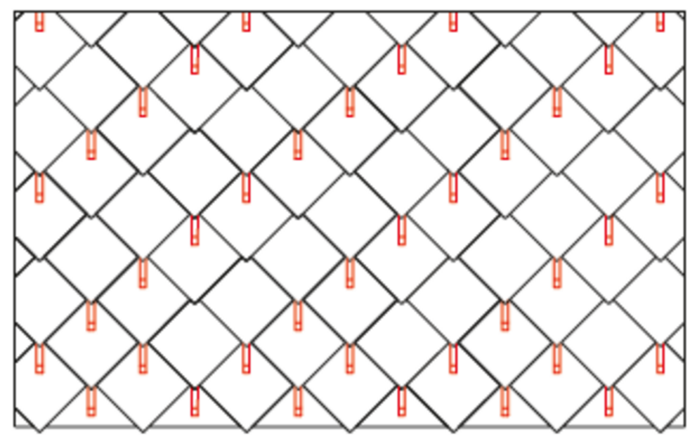 Snow guards are respectively pushed up into the centre of the punching in the rhomboid roof tiles 44 × 44 and fastened with at least 2 grooved nails. The number of fastenings in the rhomboid roof tiles 44 × 44 is not affected by the use of snow guards. With rhomboid roof tiles 44 × 44, 1.3, 2.6 or 5.2 snow guards are installed per m² (see table below - Installation patterns DR44 1, DR44 2 and DR44 3). The first two rows (starting plates for rhomboid roof tiles 44 × 44 and the first row of rhomboid roof tiles 44 × 44) must be equipped with snow guards throughout.