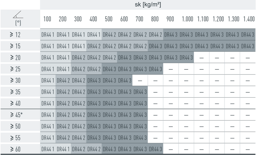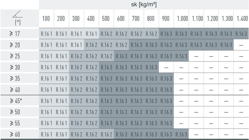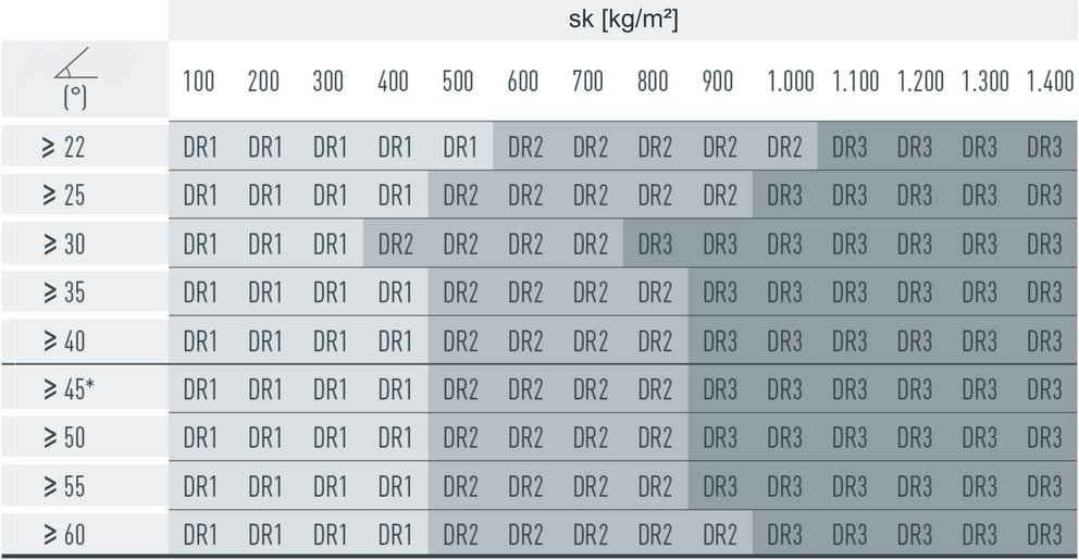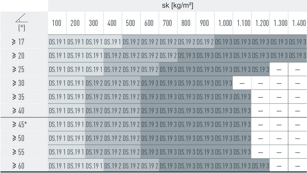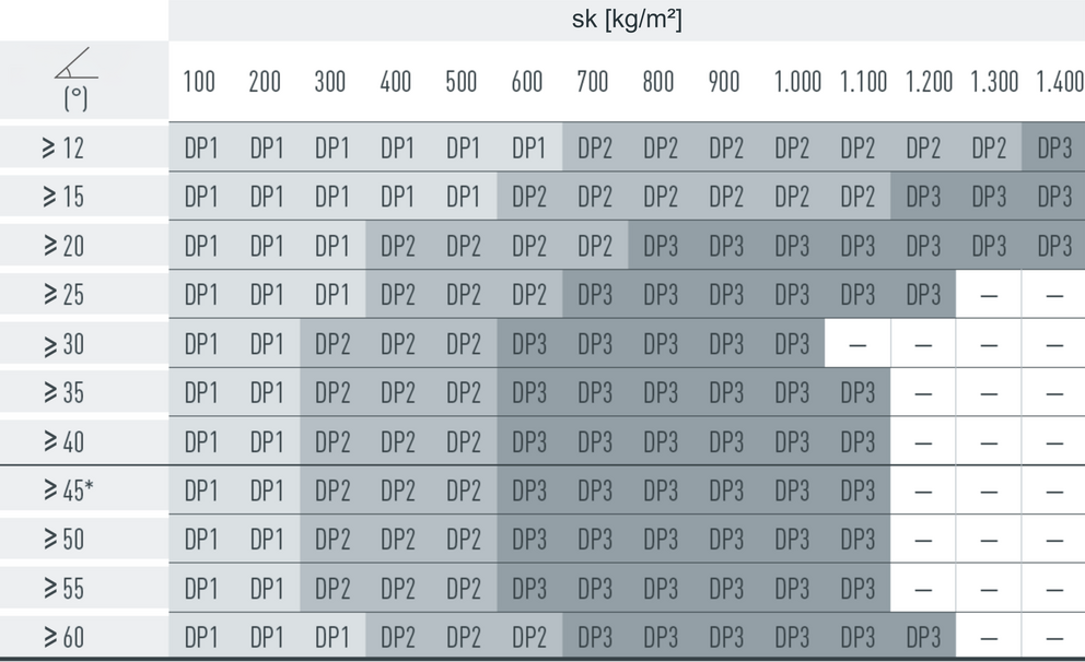 The snow guards are installed according to the following installation patterns, depending on the snow load and roof pitch. The applicable installation patterns are shown in the tables listed below. Observe the information on the roof pitch in the vertical direction and the snow load on the ground (sk) in the horizontal direction. The snow loads (sk) to be considered for the respective construction project must be taken from the national standards and regulations.