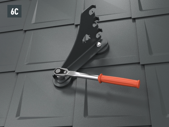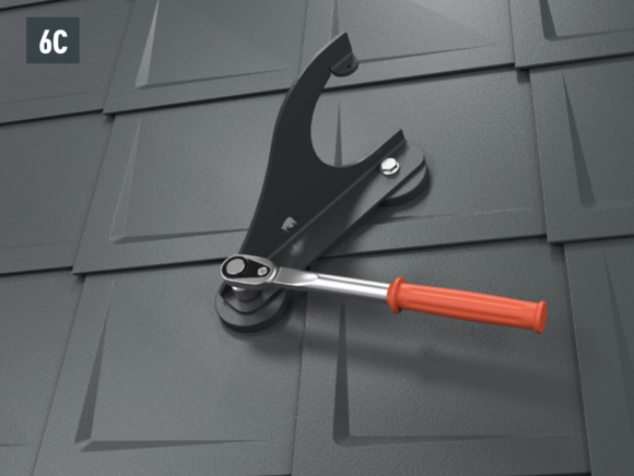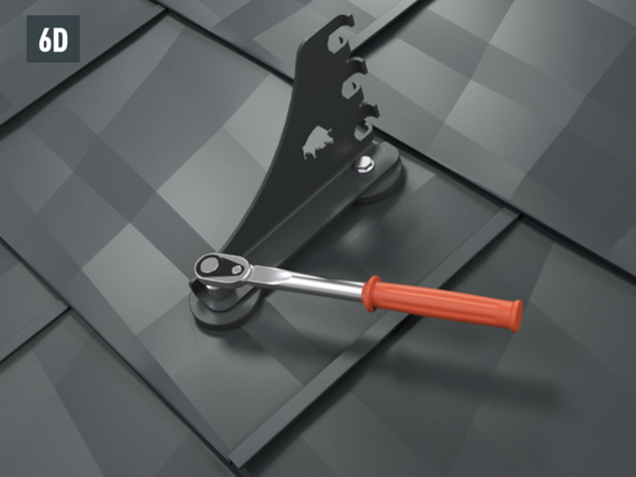 Mounting of the mountain snow guard bracket with two hexagon head screws (M12) to the foot parts (SW19; torque: 35 Nm) for roof tiles (Fig. 6A), shingles (Fig. 6B), rhomboid roof tiles (Fig. 6C), R.16 and FX.12 (Fig. 6D).