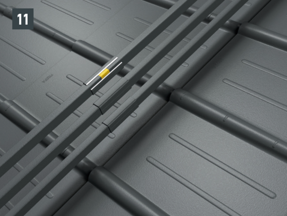 The XL snow rake brackets are installed with two foot parts in the rafter on the roof membrane. The insert profiles are inserted into the XL snow rake bracket and fastened with a fixing slider. The insert profiles are then connected to each other using sleeves – total height 360 mm.