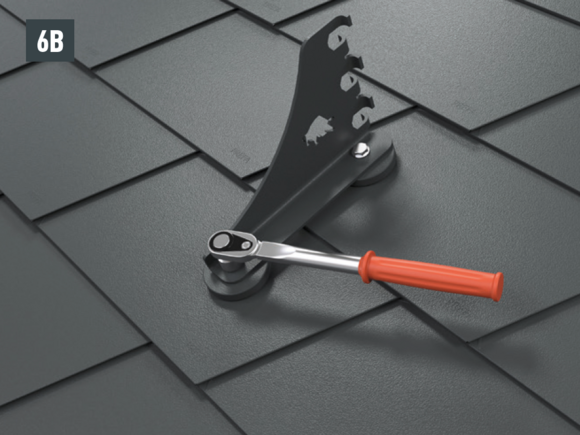 Snow guards are respectively pushed up into the left of the two DS.19 shingle central plate punchings (marked “ST”) and fastened with at least 2 grooved nails. With a DS.19, the number of clips is not influenced by the use of snow guards.