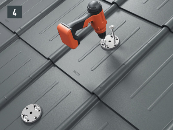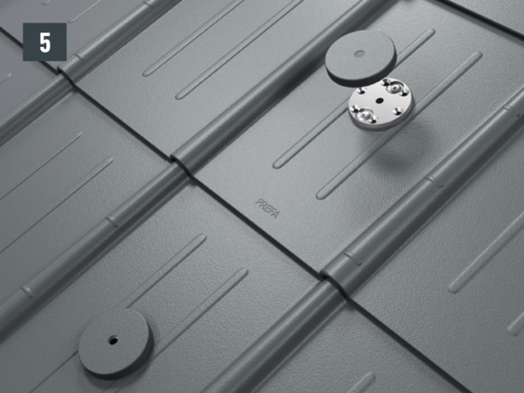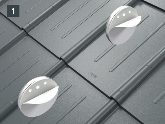Do not place and fasten foot sections on the fold or crest of the PREFA roof coverings. Observe mounting areas on the respective roof products. It may be necessary to fit a base plate (e.g. if there is a rebate or crest in the area of the rafters).
