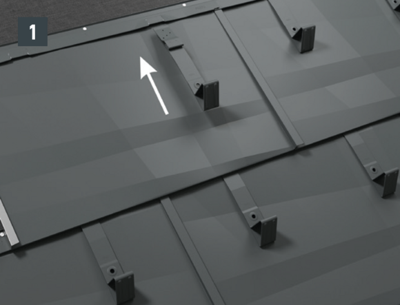 With FX.12 roof panels, 1.7, 3.4 or 6.8 snow guards are installed per m² (see table below - Installation patterns FX.12 1, FX.12 2 and FX.12 3). The first two rows must be equipped with snow guards throughout.
