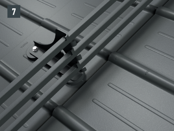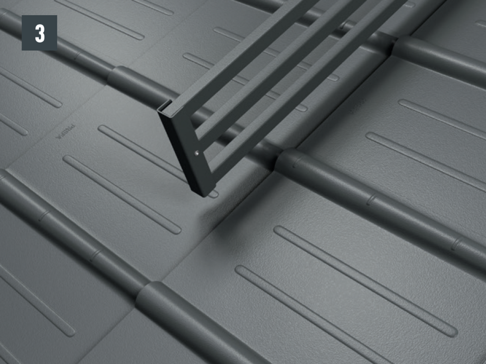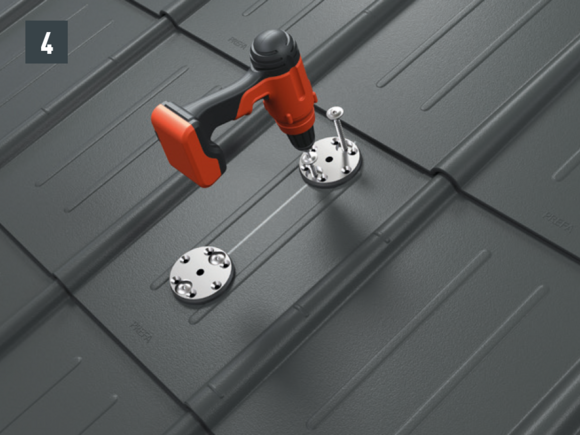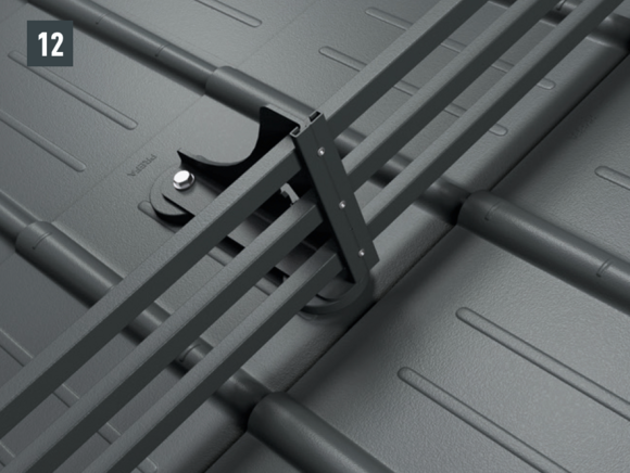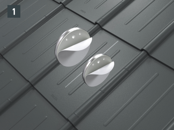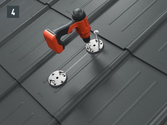 Snow guards are pushed up on the curved embossing on the fold and fastened with at least 2 grooved nails. The number of fastenings in the R.16 roof tiles is not influenced by the use of snow guards.