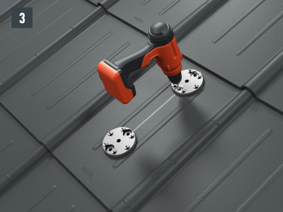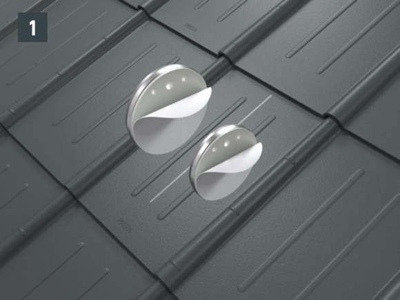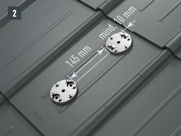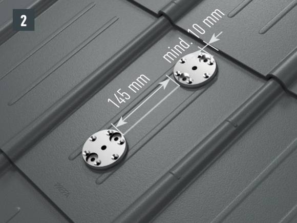 For attachment to the rafter, the drill holes (∅ 8.5 mm) must lie on the axis of the snow rake hook (course of the rafter) - Fixing screws in one axis with the rafter. Remove rear protective film on the foot parts, position and stick on (Fig. 2).