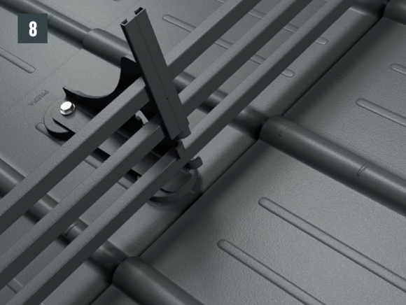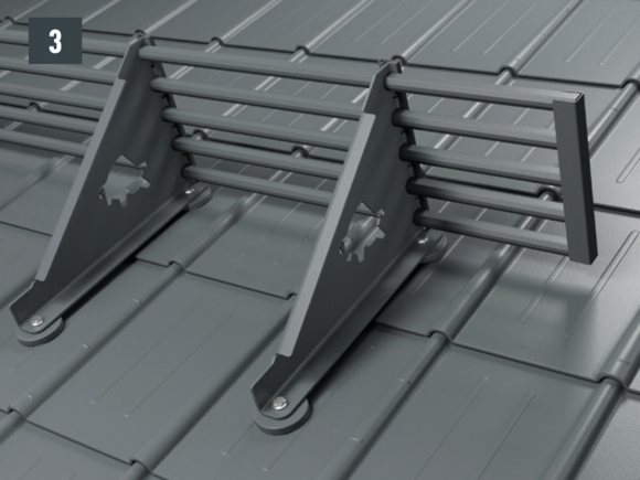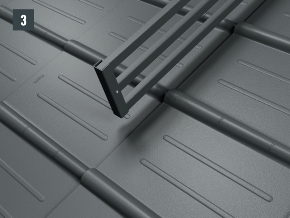 The snow rake brackets are installed with two foot parts on the roof membrane. The insert profiles are inserted into the snow rake hook and fastened with a fixing slider. The insert profiles are then connected to each other using sockets - Total height with foot parts: 219 mm.