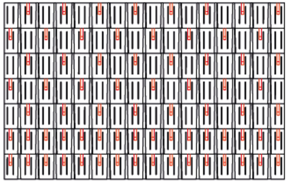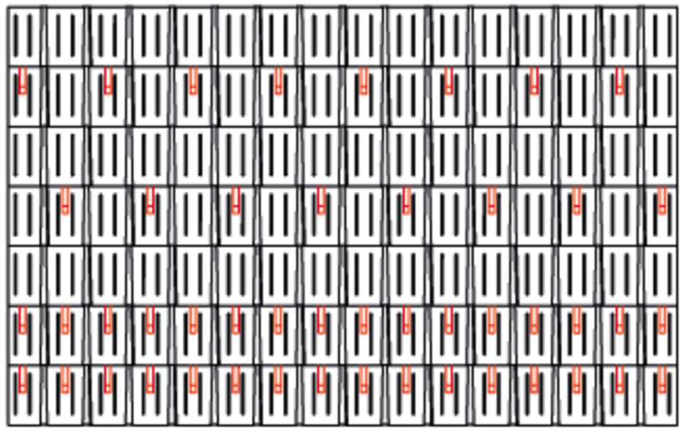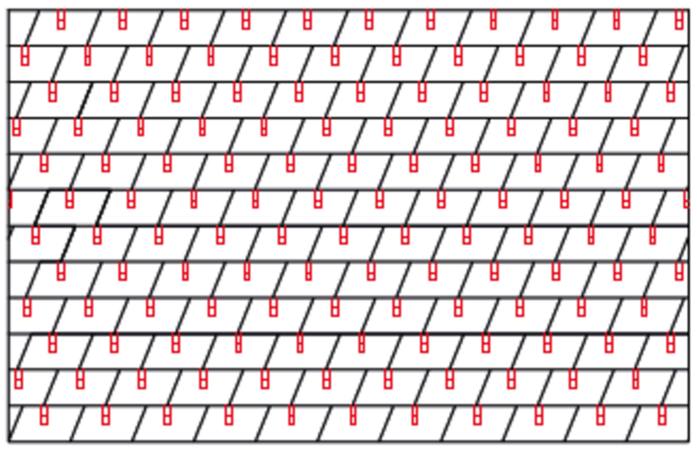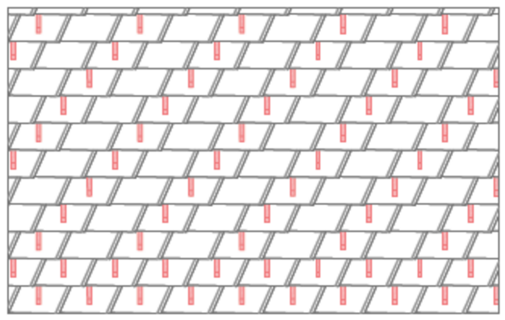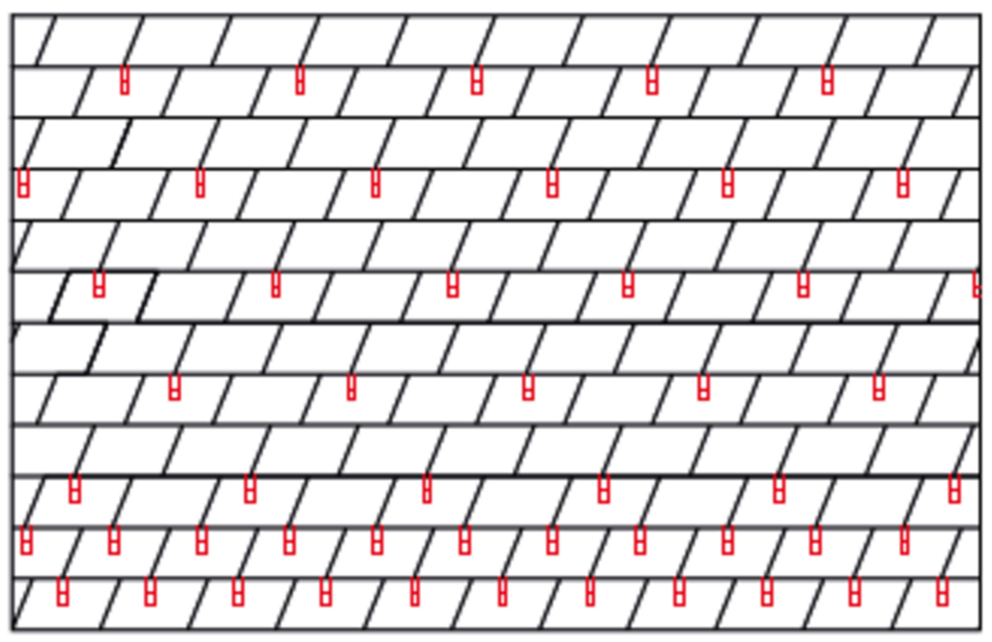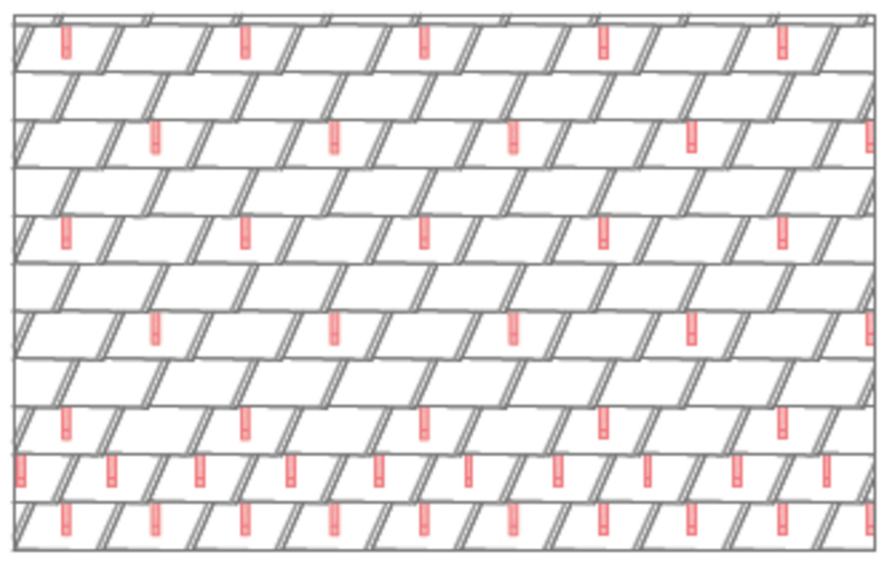 With rhomboid roof tiles 29 × 29, 3, 6 or 12 snow guards are installed per m² (see table below - Installation patterns DR1, DR2 and DR3). The first two rows must be equipped with snow guards throughout.