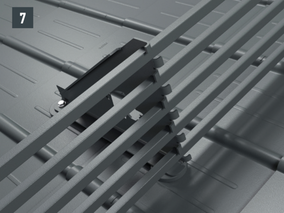 As an additional measure, a snow rake or pipe-style snow guard system can be installed above house entrances and publicly accessible areas. In the area of dormers, chimneys, solar panels, roof hatches, skylights, ventilation pipes, awnings, etc., it may be appropriate, depending on the situation, to attach additional snow retention devices (increased number of snow guards or snow rakes). Install snow guards according to the calculated installation patterns, depending on the roof pitch and snow load. Fasten each guard with at least 2 grooved nails. Only use original snow guards.