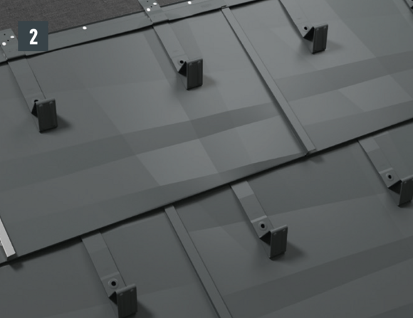 Snow guards are pushed up on the curved embossing on the fold and fastened with at least 2 grooved nails. The number of fastenings in the FX.12 roof panels is not affected by the use of snow guards.