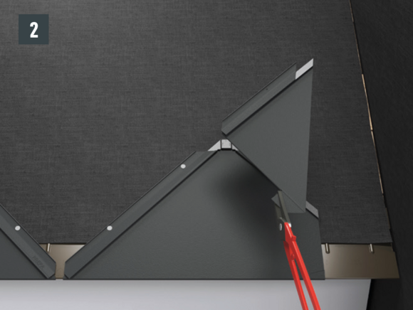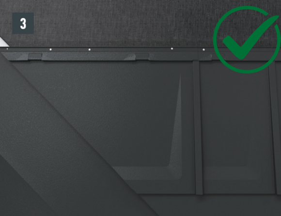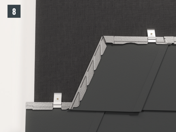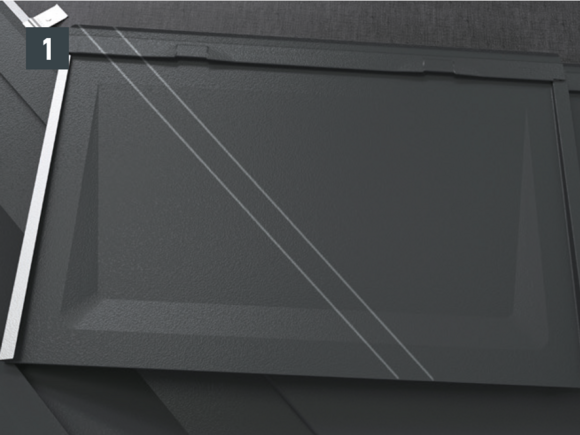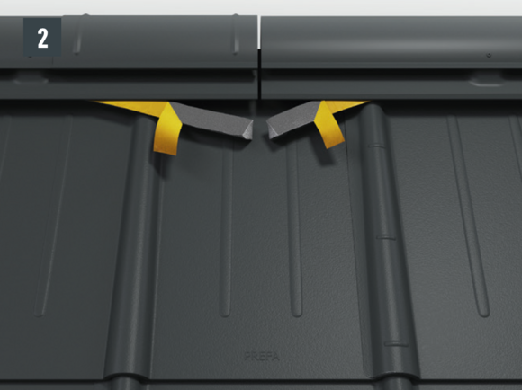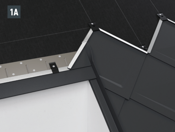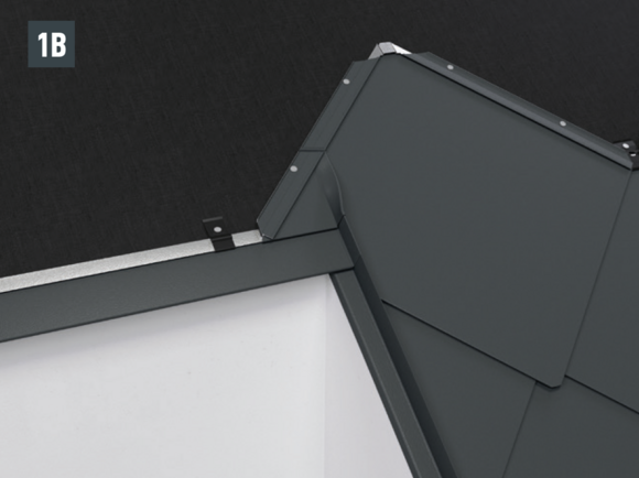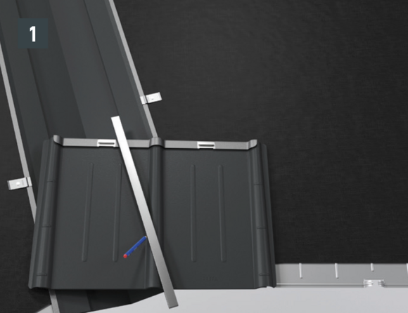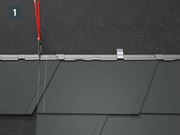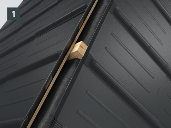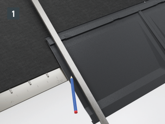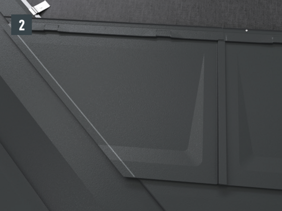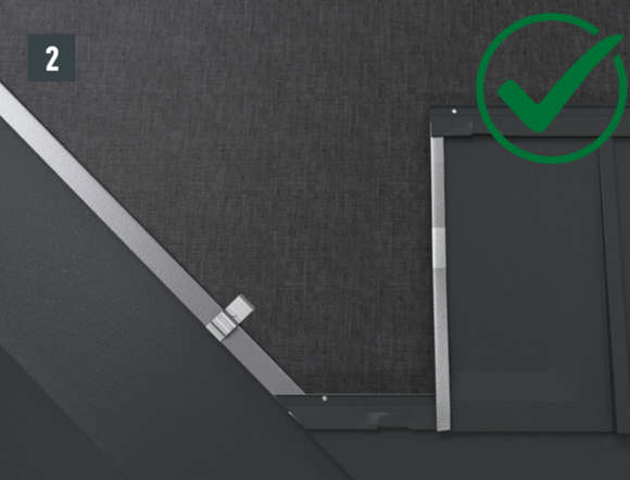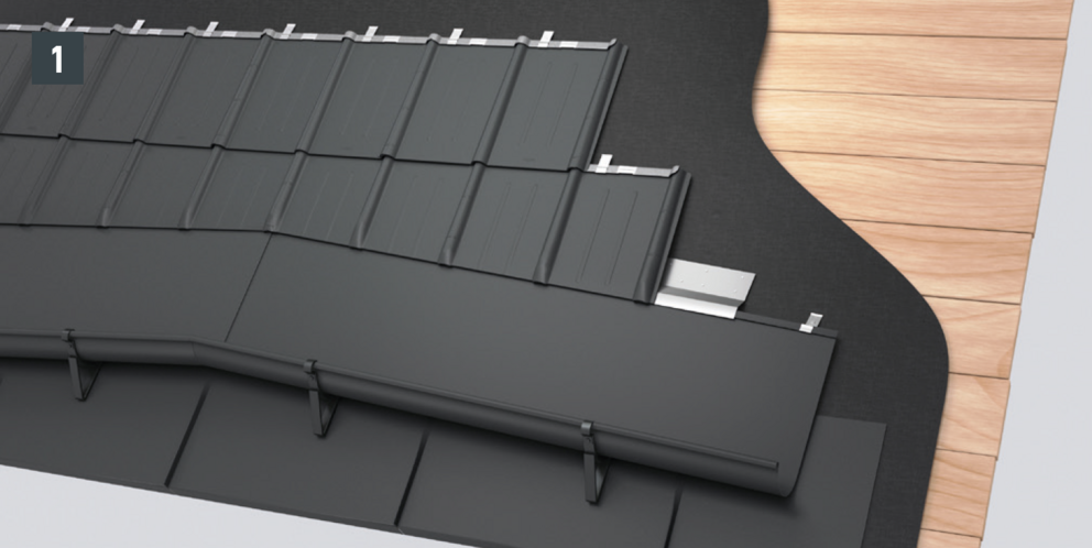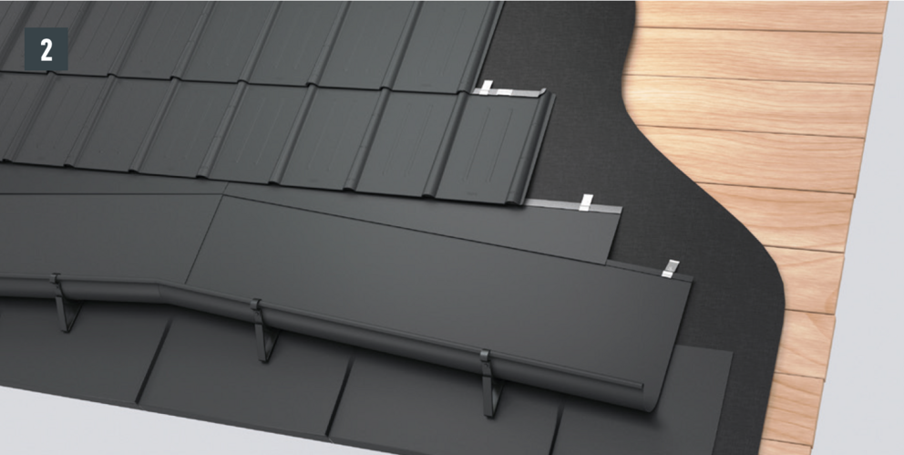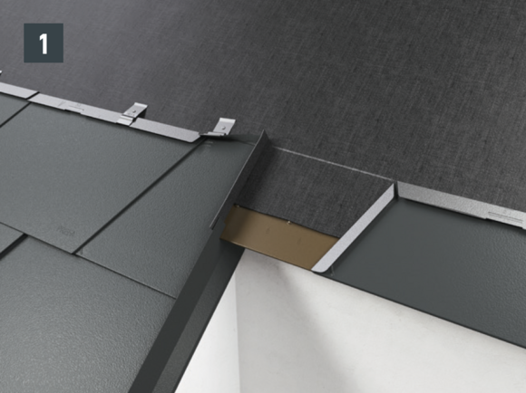 • Installthe second starter strip (beaded starter strip) over the first row of panels at the level of the fold of the main roof. Depending on the construction site, insert a sealing tape to create a gap for the flat lock welt of the roof tile above (Fig. 1).
