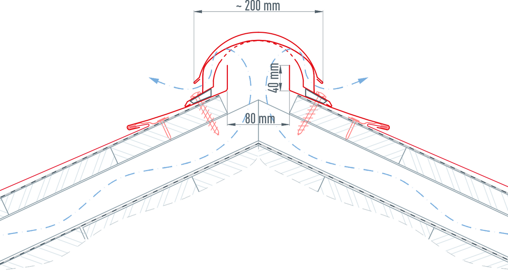 The original PREFA ridge vent has an apron on both sides. Nevertheless, raise the roof covering 40 mm to achieve a rainproof connection.