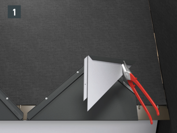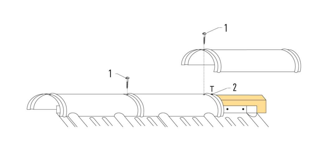• Cut the upcoming ridge caps according to required shape, allowing an overlap of 10 mm at the hip side, and fix both parts with screws (Fig. 1).
