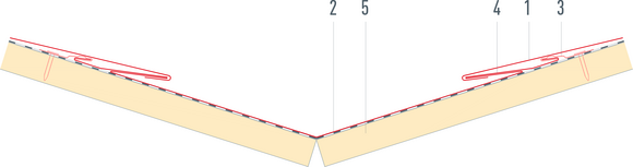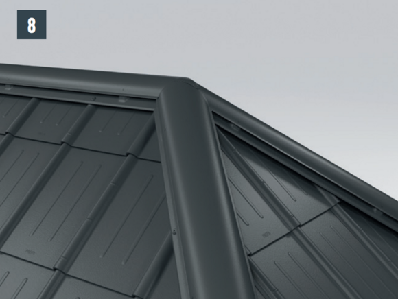 The covering direction should always be selected in the direction of thevalley. As a result, if snow and ice slides off in this area, the overlap groove is prevented from bending up.