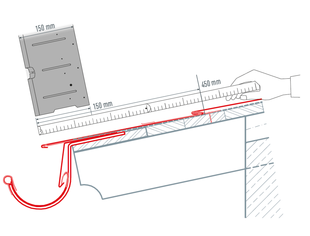 Measure from the planned top of the first roof tile 450 mm towards the eaves (ensure that the eaves overhang is between 30 and 80 mm). Make 150 mm (starter strip width) from below a mark (= starter strip width upper edge).