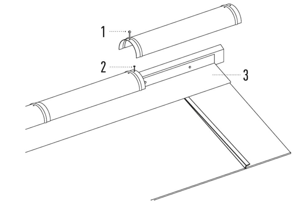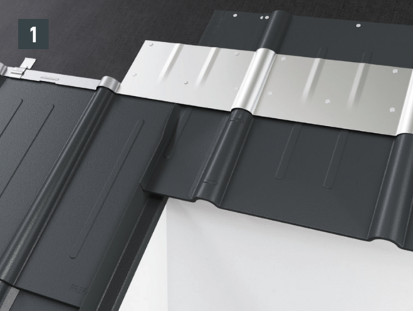 The supplied cover flashings (1) must be fitted between the end plates for rhomboid roof tile 29 × 29.