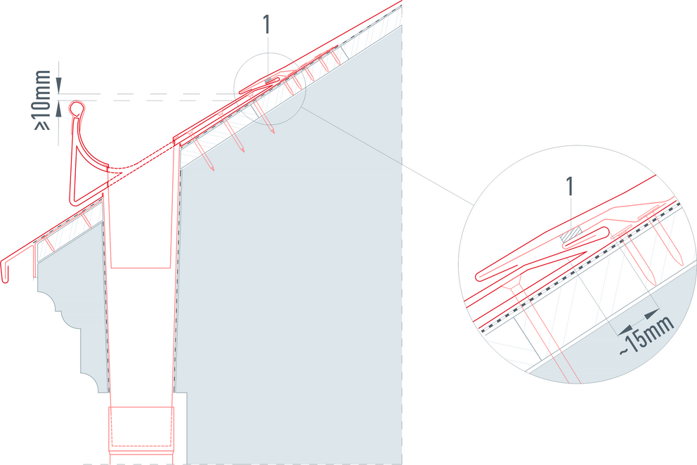 The eaves overhang of the starter strip should be in the rear third of the gutter width and may not exceed 80 mm.