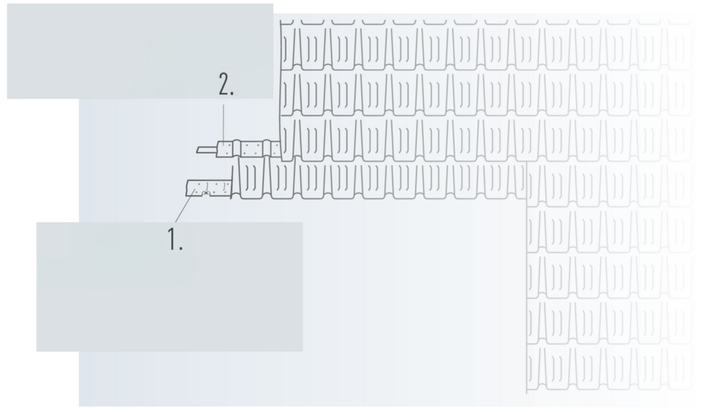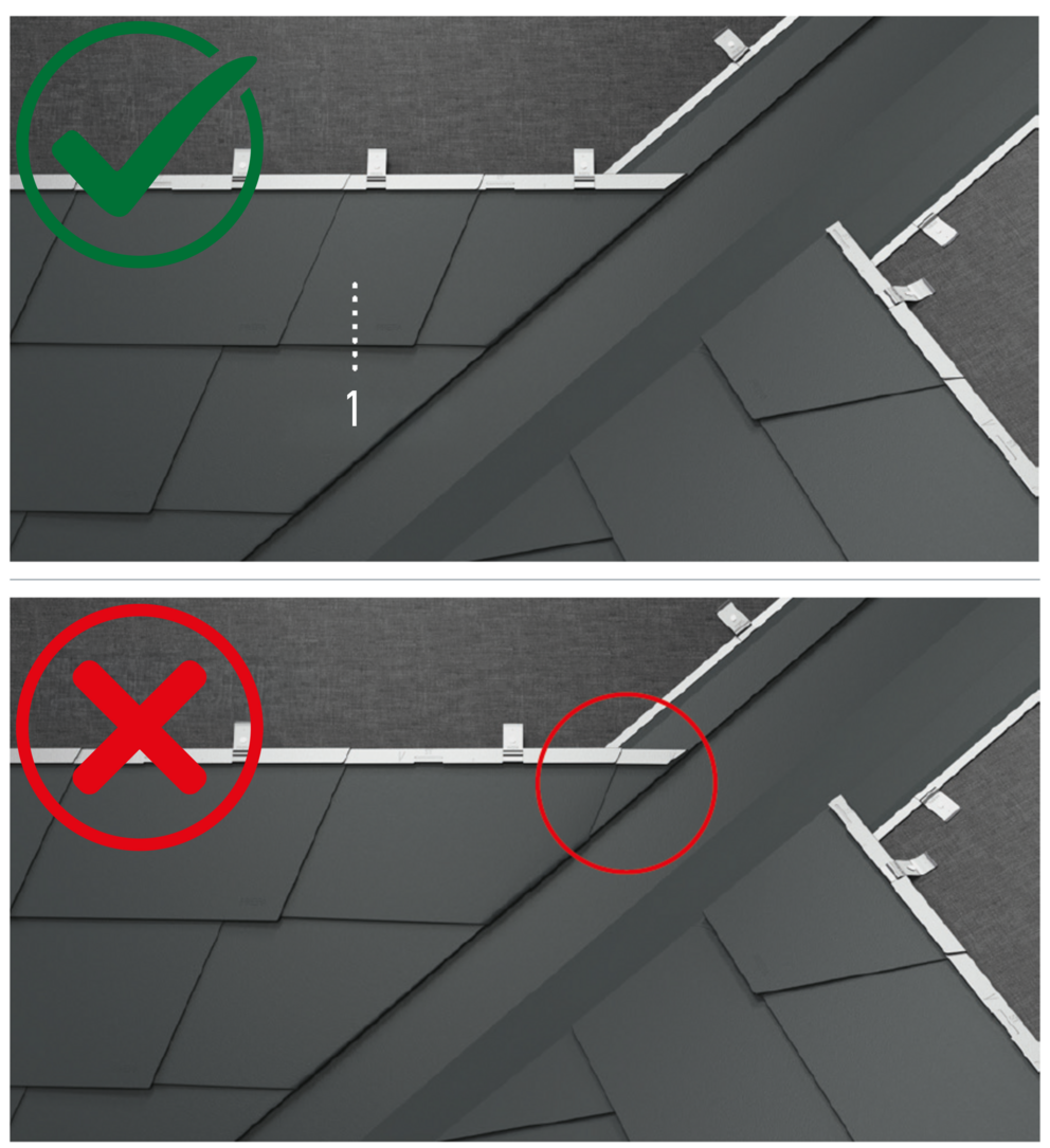 If the intersection point coincides with the valley on the left-hand side, a shortened shingle (1) or fitting shingle (1) must be assembled and installed.