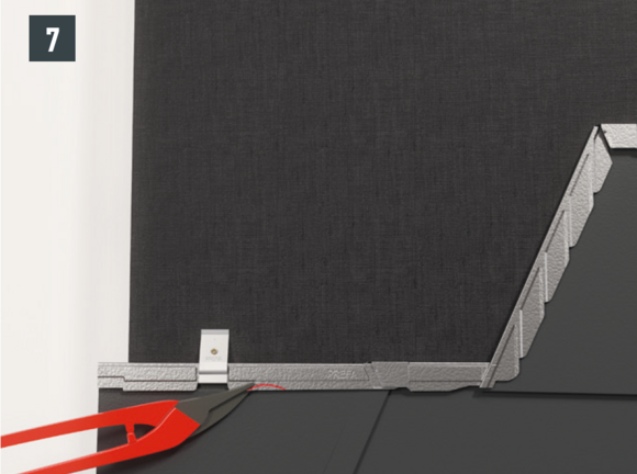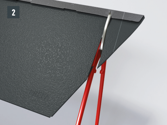 Fasten the last (cut, if required) row of tiles with a return clip, by means of a direct fastening to the side of the bead of the underlying bead (with PREFA roof panels) or by means of a direct fastening above the foam wedge of the jet fan.
