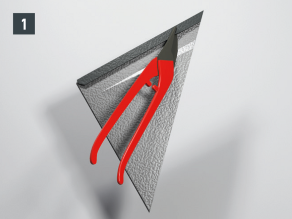 With each lateral upstand of the rhomboid roof tile 29 × 29 (verge flashing and edging), the folds running diagonally downwards are to be cut out and bent up on the underside.
