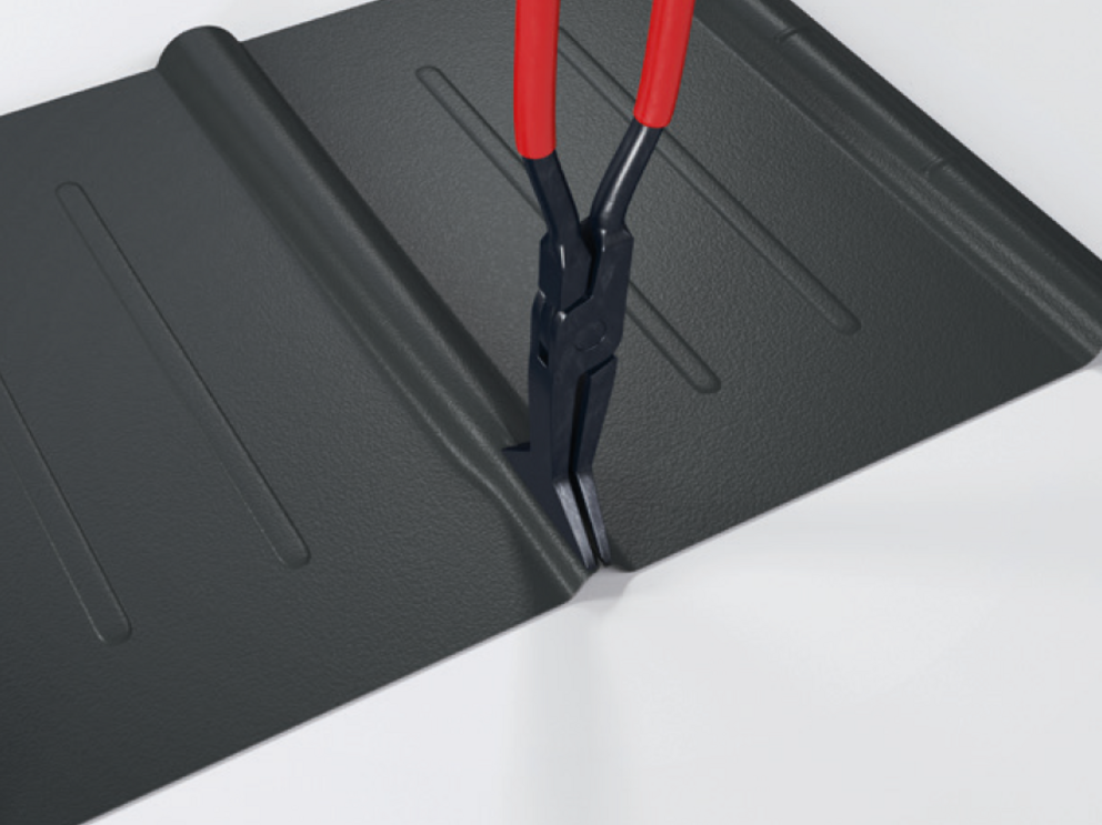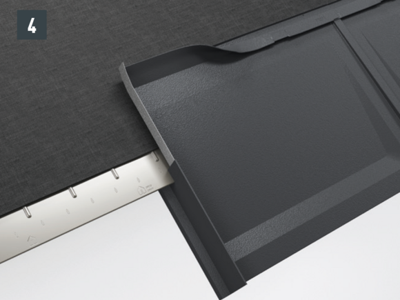 Notch the upper patent fold in the area of the raised edge so that a hook fold remains (Fig. 1 and 2), and bend the R.16 roof tile or the FX.12 roof panel upwards 30 mm at a right angle to the roof surface.