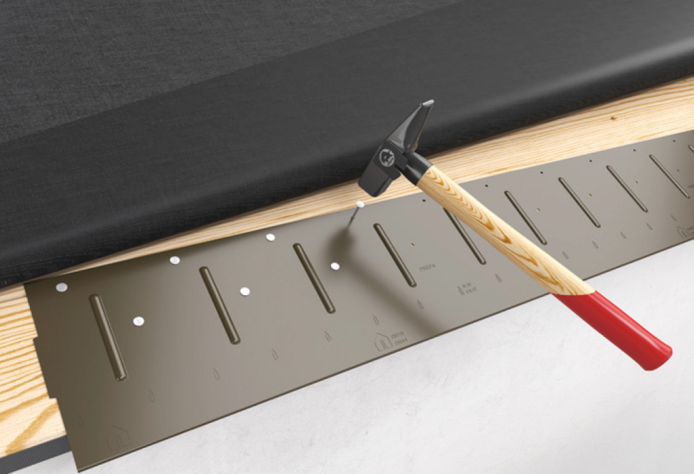 The starter strip is to be nailed storm-proof (nail out all pre-punched holes). Pin the starter strip through before nailing out any pre-punched holes with the supplied PREFA nails.