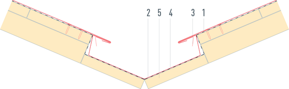 • In cases of very different roof pitches or if the amount of water varies greatly, the valley has to be recessed orhas to be joint with a doble lock standing seam in the middle.
