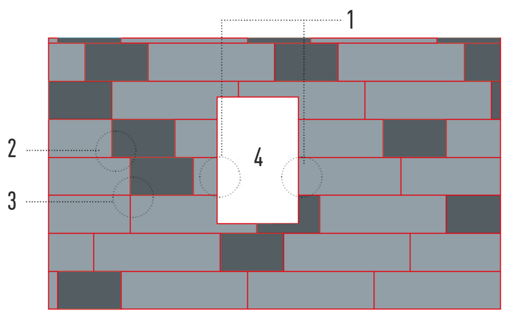 A clipped FX.12 panel was reused (1) on the other side of the opening (4). Thus, a correct pattern is no longer guaranteed (2) and in the worst case can lead to an overlapping of vertical joints (3). For this reason, installation examples were created for an optimal joint offset.