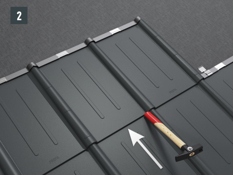 Press the panel into the hook fold. Strike the bottom edge of the panel lightly with the handle of the hammer (Image 2).