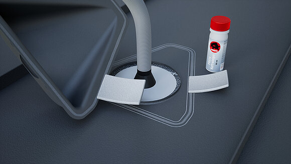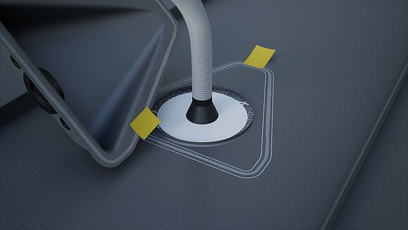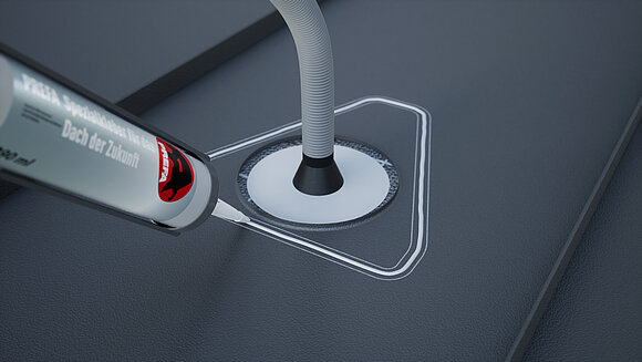 Apply special adhesive all around and feed the corrugated tube through the grommet. Then place the solar roof conduit and press it down in the middle.
