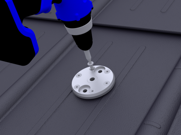 Attach each foot part to the rafter with two fixing screws ⌀ 8×220 mm (double-skin roof structure) or ⌀ 8×120 mm (single-skin structure) until the surface seal is pressed onto the roof covering and sub-structure framework. When mounted correctly, the surface seal should bulge slightly outwards (Torx bit: T40).