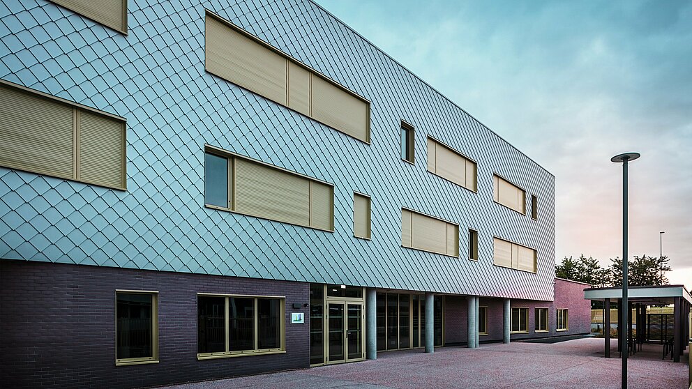At CLARC, all decisions also have a pragmatic side. The clinker brick on the ground floor is robust enough for everyday school life, where balls or school bags sometimes bounce off the walls. The aluminium above reflects the light and makes the building appear almost floating. The choice of colours does not follow any fashionable trends either, as the school building has to function for decades.