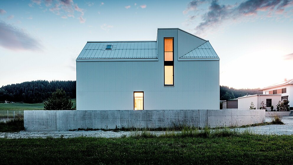 An all-over metal cladding from the pointed roof to the dormer and façade requires special expertise. Schneider Lengauer Pühringer therefore entrusted the implementation to the experienced plumbing and roofing company Kapl Bau GmbH. ‘The jagged PREFALZ standing seam façade was a challenge in places,’ says tinsmith David Thumfart. But outstanding results are often based on unconventional solutions. And so, in just one machine pass, double-swivel strip metal was canted several times in opposite directions without damaging the resistant P.10 coating. The roof edges also broke with conventional thinking: standard parapet covers did not fit into the concept. ‘That's what makes projects like this so exciting – you don't just follow a set formula, you have to think for yourself,’ said Thumfart happily.