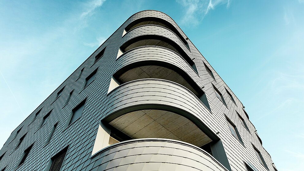 The new building combines solid construction with an unusual appearance. This is partly due to the edgeless triangular shape of the building. On the other hand, its ‘scaly reptile skin’ made of small PREFA façade shingles in P.10 light grey, which form a uniform metal façade, is a real eye-catcher. It was also a good choice because, thanks to their format, the wall shingles can also be laid in a tight radius, enabling the rounded corners. ‘Traditional Swiss detached houses begin directly behind our building, and they are shingled,’ says Keller, explaining his creative design decision.