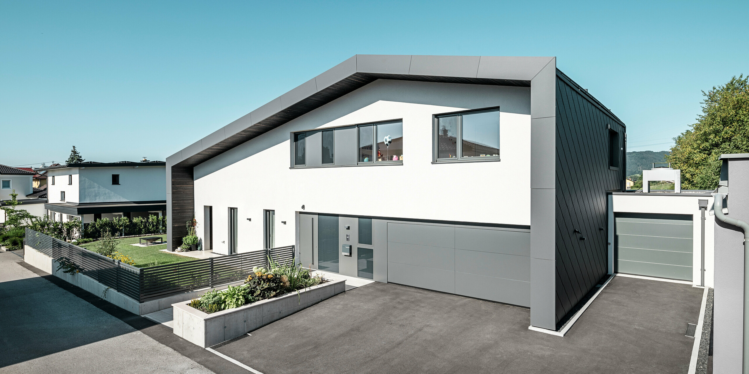 This detached house in Aschach has a timelessly modern design, which is emphasised by the use of Dark Grey PREFA 44 × 44 roof and wall tiles.